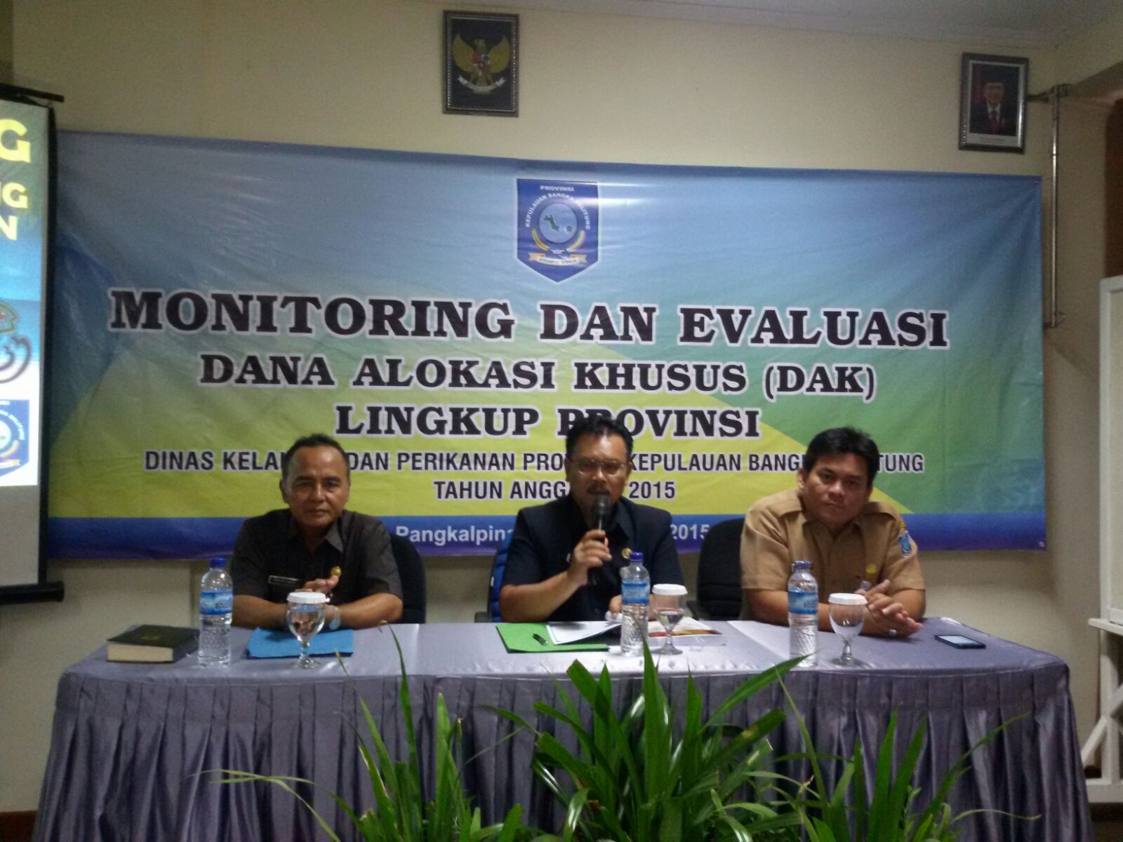 Ketua panitia, Akhmad Jaya Firdaus mengatakan tujuan pelaksanaan kegiatan Monev DAK Bidang Kelautan dan Perikanan Tingkat Provinsi Tahun 2015 adalah untuk melakukan monitoring, supervisi dan pengendalian terhadap pelaksanaan program/kegiatan pembangunan kelautan dan perikanan khususnya yang didanai anggaran DAK tahun anggaran 2015. "Kegiatan ini akan dilaksanakan selama dua hari ke depan dan kami harap Kabupaten Kota serta UPT Daerah dapat menyampaikan update progress kegiatan DAK yang telah dilaksanakan" kata Akhmad Jaya disela-sela kegiatan. Hadir sebagai narasumber diantaranya Kasubbag Perencanaan Dinas Kelautan dan Perikanan Provinsi, Fhores Fherado, MPS,M.Eng dan Narasumber dari Biro Perencanaan kementerian Kelautan dan Perikanan RI, Rindra Juniarso,S.Pi.