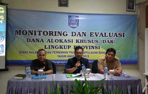 Pangkalpinang- Tahun 2016 anggaran DAK Kelautan dan Perikanan Babel naik menjadi 11 Milyar, demikian disampaikan Kadis Kelautan dan Perikanan Provinsi, Sarjulianto saat menghadiri kegiatan Monitoring dan Evaluasi Dana Alokasi Khusus Kelautan dan Perikanan di Hotel Bumi Asih, Rabu (11/11). Kegiatan ini diikuti oleh Dinas Kelautan dan Perikanan Kabupaten/Kota se Provinsi Kepulauan Bangka Belitung dan dibuka secara resmi oleh Asisten II Bidang Bidang Perekonomian dan Pembangunan Sekretariat Daerah, Dr.Ir. Budiman Ginting. "Manfaatkan kegiatan ini dengan sebaik-baiknya, sehingga hasilnya dapat melihat, mengidentifikasi dan menginventarisasi kendala yang dihadapi dalam pelaksanaan DAK baik di tingkat Provinsi maupun Kabupaten/Kota selama tahun 2015 ini" Kata Budiman saat membuka acara.